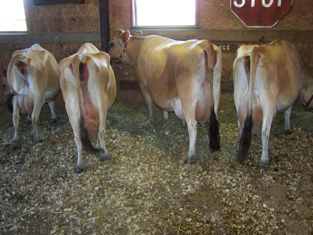 Well-proportioned regarding height to length. The small Jersey should resemble their larger counter-part completely in every aspect as to dairy type and individual. The typical cow will be refined, feminine appearance with ample substance. A straight underline with udder firmly attached front and rear with strong center support. Udder and teats should be of moderate size with teats of equal size squarely placed on an udder with clearly defined halving. Animals should exhibit sharpness and strength indicating productive efficiency. Udder should show traits that contribute to high milk yield and a long productive life.